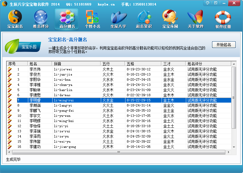 用生辰八字宝宝取名软件取名时,你只需要按分数选择名字就可以了