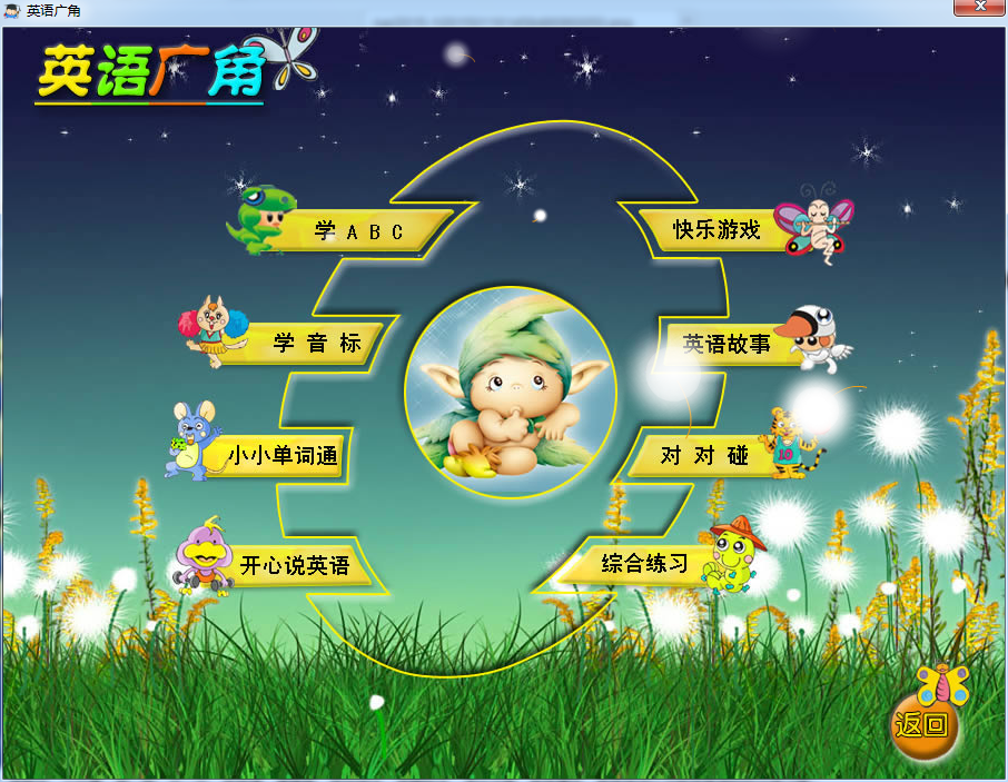 本模块包括英语启蒙的多种知识学习,包括:学ABC、学音标、小小单词通、开心说英语、快乐游戏、英语故事、对对碰及英语方面的综合练习。