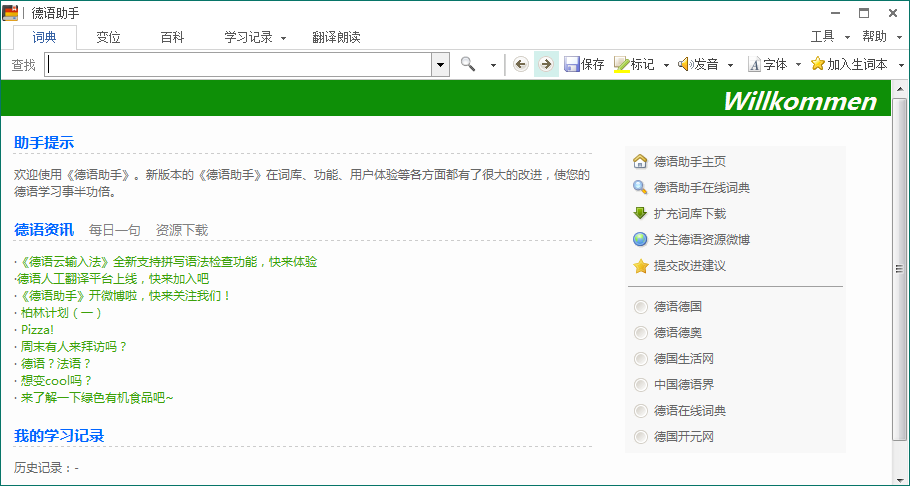 《德语助手》支持智能查找,无须再输入德语字符,如später您可以直接输入spater。