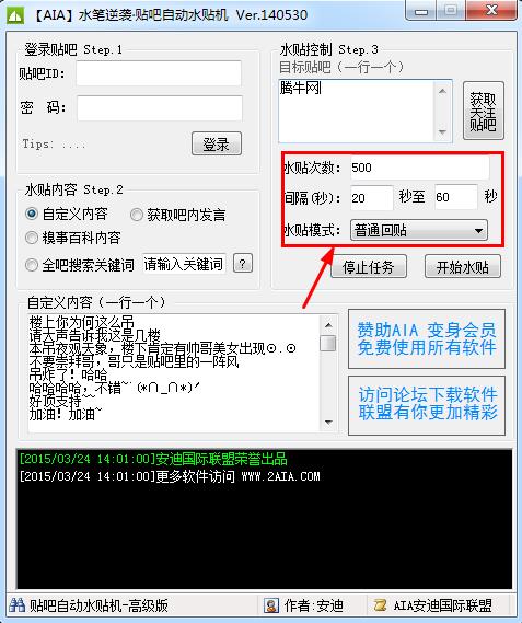 水笔逆袭贴吧自动水帖机是一款专门针对百度贴吧制作的自动水贴工具,这款软件可以帮助你自动回帖,包括普通回帖和楼中楼回帖两种水贴模式,这款贴吧自动水帖机绿色小巧,免费使用,你只需要登陆贴吧账号,选择目标贴吧,设置好水贴内容和水贴次数、频率它就能帮你自动水贴了,欢迎下载使用!