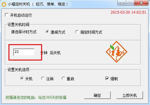 小福定时关机软件是一款绿色小巧的桌面定时关机软件,它可以帮助你自动关机,这款关机软件操作简单,你只需要提前设置好关机时间、关机选项,如关机、注销、重启等操作,递减模式和指定时间关机,它就能在指定的时间为你自动完成关机操作了,欢迎需要的朋友下载使用。