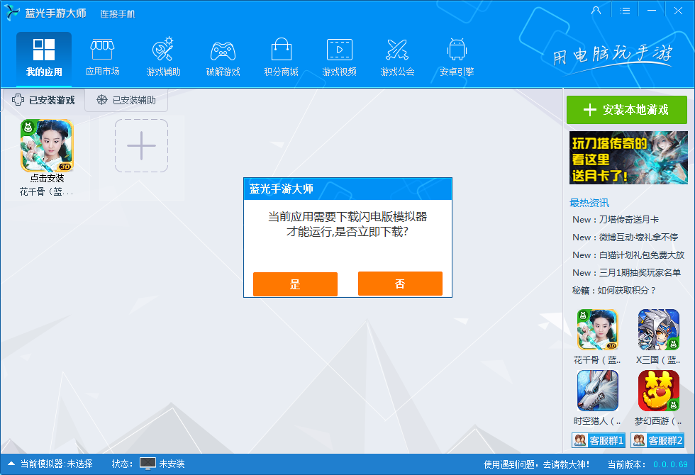 5、游戏下载完成之后,点击安装,会提示需要下载闪电般模拟器,点击是,软件自动下载安装。