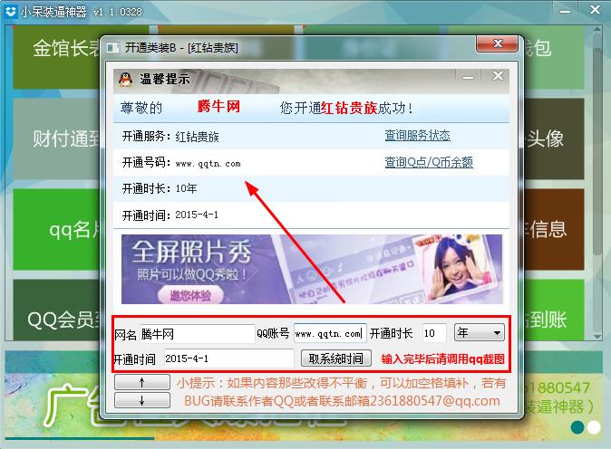 小呆装逼神器是一款由网友小呆制作的QQ装逼神器,这款软件主要是针对QQ的业务开通等信息,支持我的钱包、财付通、QQ资料、QQ会员到账、红钻到账、黄钻到账、QQ飞车装逼等信息进行修改,功能强大仿真度极高,欢迎有需要的用户下载使用!