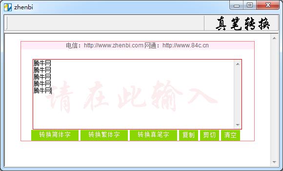 真笔转换是一款真笔字即时转换器,这款软件兼容所有中文输入法,是新新人类qq聊天的必备工具,让你快速在繁简字体之间转换自如,软件操作简单,复制黏贴就可以了。有需要的朋友欢迎下载使用。