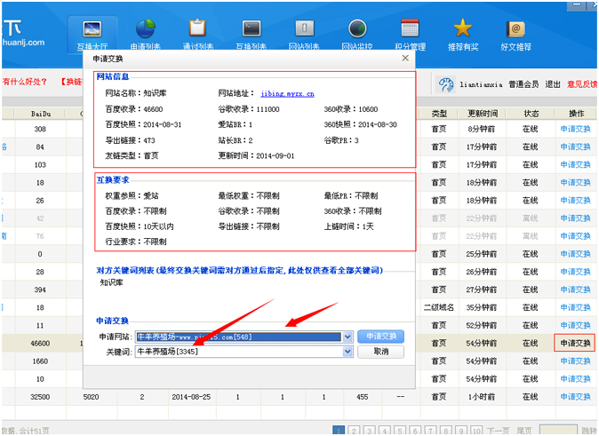 第四步:查看对方详细数据,觉得符合自己网站条件后,选择好申请交换的网站及关键词点击“申请交换”,系统会向对方发送弹窗提示。