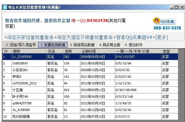 淘宝买家信誉批量查询工具是智者软件推出的淘宝买家信誉查询软件,这款软件可以帮助你批量查询买家的信誉,包括批量查询淘宝、天猫买家最近一周、一月、半年、半年之内的信用点数,以及淘宝账号的类型、注册时间、是否实名认证等,是淘宝卖家用户的必备工具!