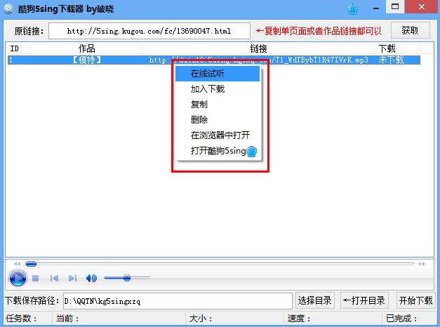 酷狗5sing下载器是一款由破晓制作的专门针对酷狗5sing的音乐下载工具,这款软件可以帮助你一键获取酷狗5sing的音乐链接,为你提供在线试听、本地下载、复制、删除、在浏览器中打开以及通过酷狗5sing打开等功能,喜欢逛酷狗5sing的朋友千万不要错过这款破晓酷狗5sing下载器哦!