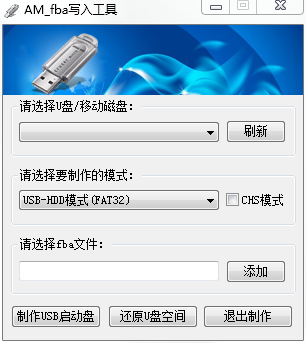AM_fba写入工具可以将fba文件写入到U盘或移动磁盘中,支持五种CHS模式,如“USB-HDD模式(FAT16)/USB-HDD模式(FAT32)/USB-ZIP模式(FAT16)/USB-ZIP模式(FAT32)/USB-ZIP模式(FAT16)[复制PBP到MBR]”。