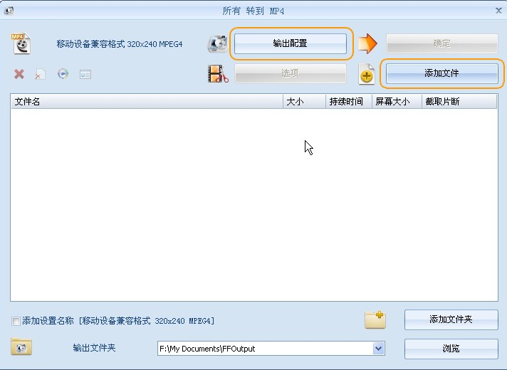 2、添加您想要转换的文件,您可以点击“输出配置”来改变配置,完成后点击确定