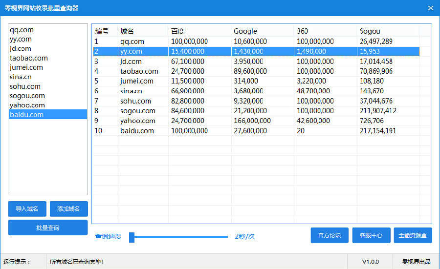 零视界网站收录批量查询器是由零视界官网最新出品的软件,它专为网站站长设计,帮助他们对网站的收录情况进行批量查询,零视界网站收录批量查询器支持批量导入域名,批量查询百度、Google、好搜、360搜索、搜狗等搜索引擎的收录情况,及时了解自己网站以及其他相关网站的信息。速度快,准确实用,绝对是站长必备神器!