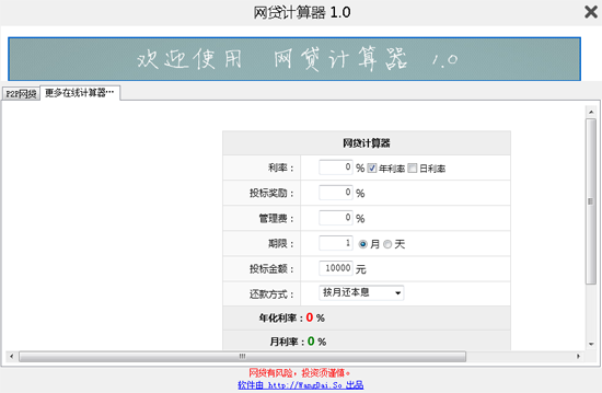 如果你是一名P2P网贷投资者,那么这款网贷计算器是你电脑必不可少的小工具,它小巧便捷,可以帮助你计算P2P网贷、利率等数字。