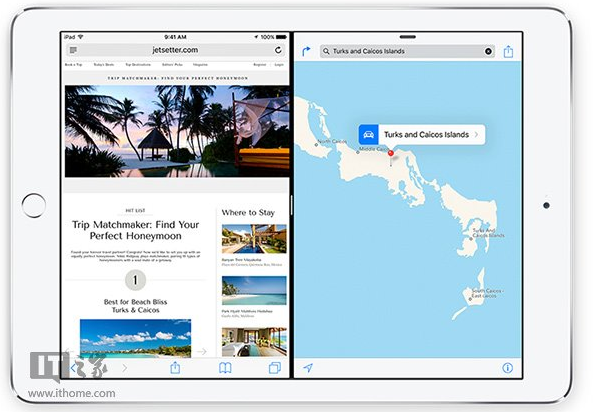 2、Split View功能,可将屏幕分成两部分,同时运行两个应用。也支持同一款应用的多界面,比如 Safari 浏览器中可并排摆放两个标签页。此功能目前只能在iPad Air 2上实现。