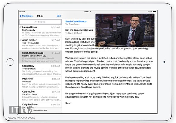 3、Picture in Picture功能:用户在看视频过程中如果想看或回邮件,视频将以悬浮窗口的形式保留在屏幕上,大小和位置可任意调整。