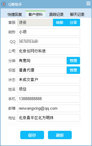“Q客助手”是一款利用普通QQ实现的在线客服管理系统,可以对网站客服QQ悬浮窗口进行设置,统计QQ客服聊天记录、客户接入量、成交率等监督功能,以及对QQ客户进行CRM管理、数据分析,同时带有快捷回复、客户跟踪记录等辅助功能。