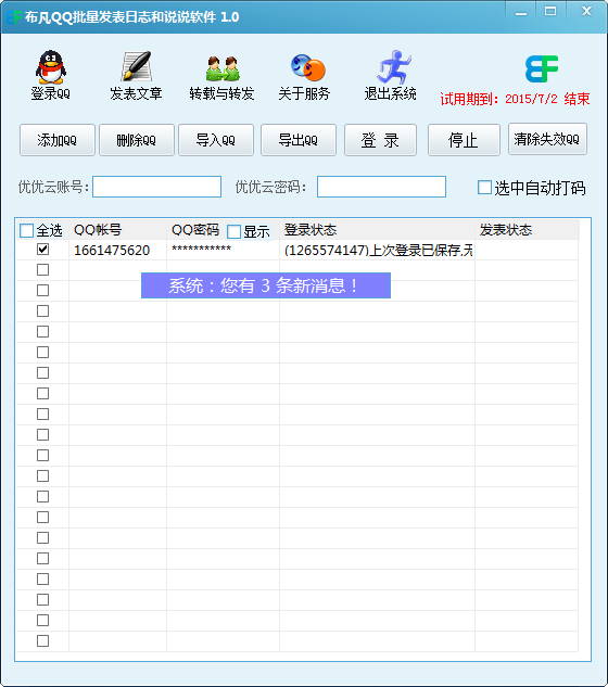 布凡QQ批量发表日志和说说软件是一款专为QQ营销人员设计制作的软件,这款软件支持批量自动登录QQ,支持对登录对QQ小号批量发表同篇日志和说说,另外它还支持对指定目标QQ的日志进行选择性或全部转载等功能。布凡QQ批量发表日志和说说软件采用web协议方式登录空间、可对自己QQ小号批量发表同篇日志!