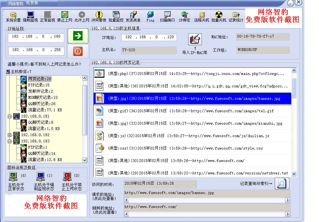主机扫描结束后,就可以对扫描到的存活主机进行各种监控操作了。软件默认都是正常监视,如果其中的某个主机和本机是处于同一共享网络中(即hub所连的),则那个主机的所有上网数据本机都可以监视到,如不是处于同一共享网络的话(如交换机或路由器等),则可以通过点“强制监视”来强行查看目标主机的上网数据。(注意:强制监视时,要关闭当前本机运行的防火墙程序,因为防火墙的存在会使被监视主机无法上网。)如想停止对目标主机的强制监视,则通过点“正常监视”就可以了。“禁止上网”是禁止目标主机进行一切上网操作,对应的有“允许上网”是解除目标主机的禁止上网状态。在“系统设置”——“禁网强度设置”,可以根据各自网络情况灵活选择,分为“高”、“中”及“低”三个选项,强度依次递减。 “上网控制”是新增功能,可以分时段控制各个主机的上网。需要先设置进行上网控制的主机列表(IP和MAC),然后设置禁止上网的时间(24小时),最后点下“应用设置”就开始执行了。“冲突警告”是对目标主机产生IP冲突警告。需要注意的是,这几个控制操作:“强制监视”,“禁止上网”等都是需要对当前选择网卡进行底层操作的,如果本机操作系统中装有其他同类软件或者对网卡底层有保护设置,都会导致操作失败,请根据错误提示自行解决。