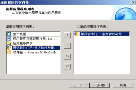 如果对方接受了您的“邀请”,将弹出“应用程序共享向导”,选择您想被共享的应用程序,可以选择多个,也可以选择整个桌面。如图1.7所示。
