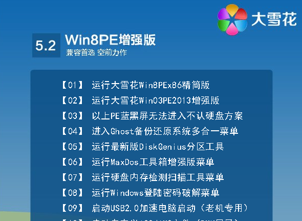 大雪花U盘启动盘制作工具实现一键制作启动U盘,真正方便快捷。大雪花制作启动U盘成功率极高,目前 没有碰到过不能制作启动盘的U盘。大雪花启动的PE系统,具有极强的硬件兼容性,装机工具齐全,可以为各类电脑安装系统。