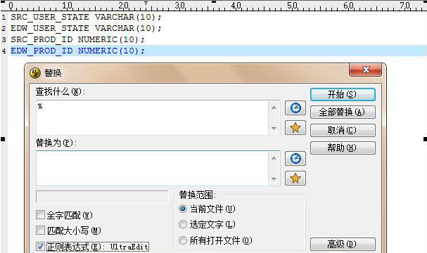 3)删除行首空格: 替换 %[ ^t]+ 为 空串