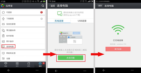 4、 打开手机上已安装的完整版应用宝,选择”管理”—》“连接电脑”功能,进入后选择无线连接中的“点击扫描”,扫描电脑上的二维码成功后就可以连接手机和电脑啦!