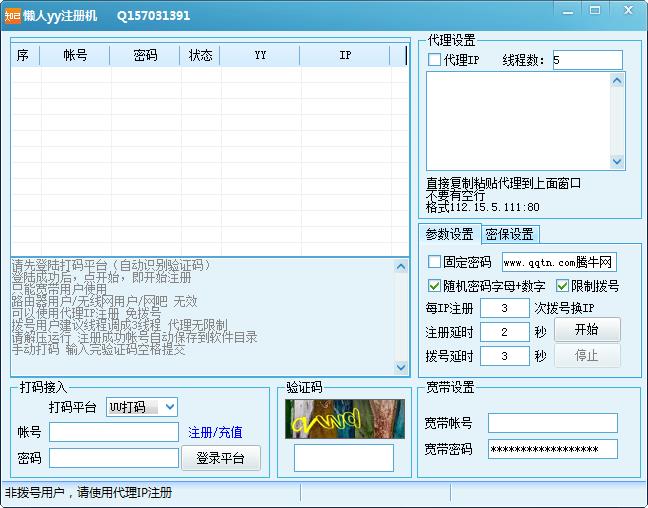 用户可以自定义账号和密码规则,支持远程打码和代理换IP注册。多线程运行,以最快速度速度挂机申请YY小号。