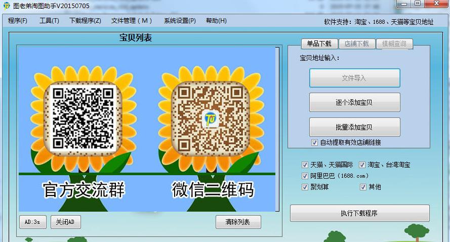 本软件是目前淘宝上功能全面的商品图片下载软件(轻松实现:淘宝图片批量下载、淘宝商品大图下载 ),极大的方便的店主对店铺的素材管理。 此软件可以一键下载阿里系列宝贝图片包含主图(sku)、展示图 、细节描述图等,同时该软件也支持速卖通图片下载、京东网图片下载、苏宁易购图片下载、唯品会商品图片下载、一号店商品图片下载等,能有实现多个链接同时同步下载。