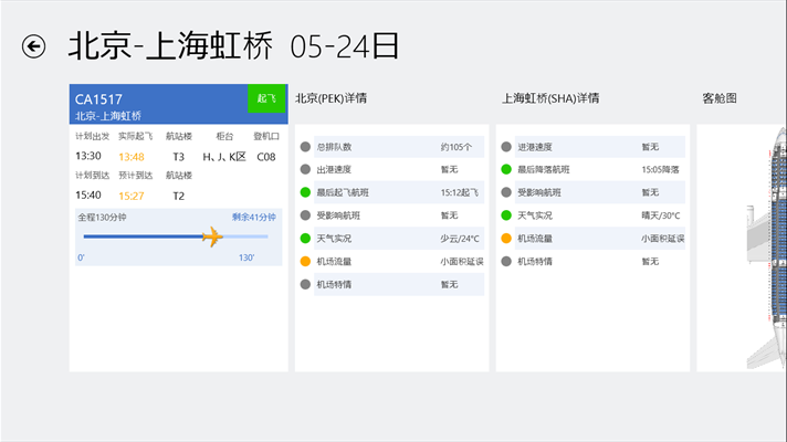 2、航班详情:提供航班目前状态、飞行时间、是否准点等信息