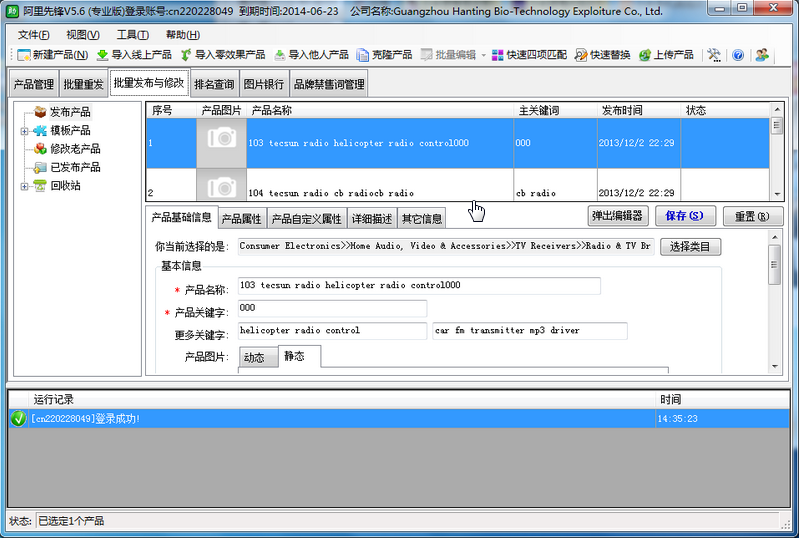 阿里先锋是阿里巴巴国际站第一款用软件代替手工上货的自动化营销软件。可以实现产品智能批量发布,具有多关键词全方位覆盖,自动产品更新,批量删除零效果产品,智能关键词组合标题,关键词排名查询等功能,还有批量编辑、修改、重发产品等功能。