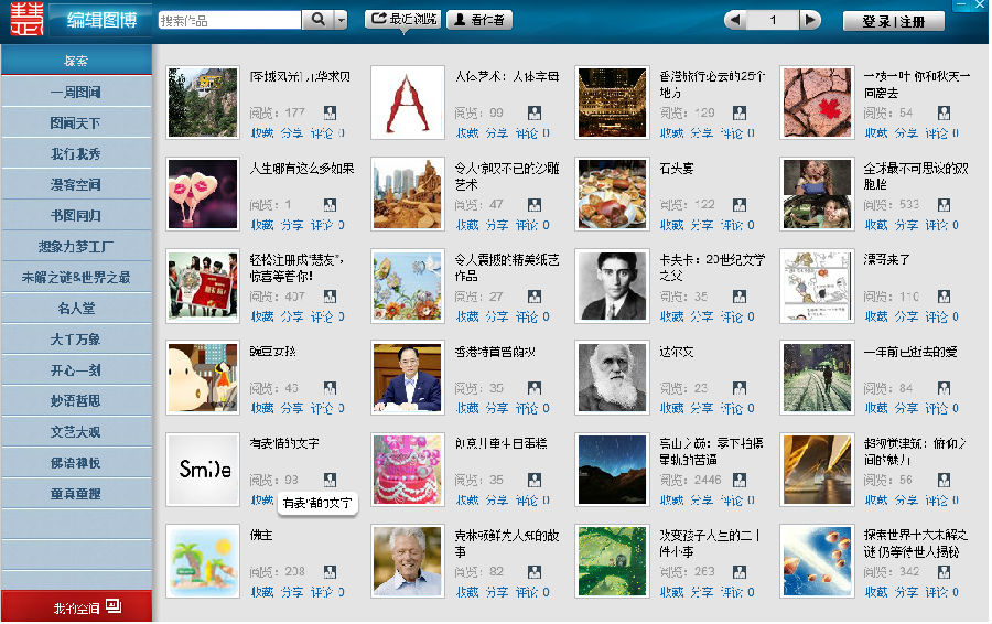 本软件集成了慧生慧色网站的功能,可以欣赏、收藏、评论、分享网友的精彩作品,也可以关注作者,发私信和作者交流。慧生慧色围绕文化创意,囊括了18个精彩的子版块,打造万人分享的内容图博。