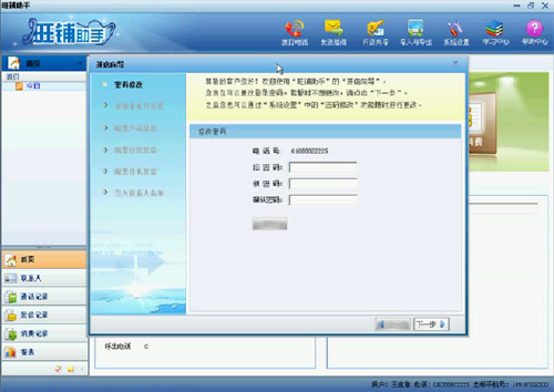 用户名为带有区号的固话号码,初始密码为开户短信中的随机内容,如未收到请拨打客服电话4008185277重设密码,用户第一次登陆客户端时,要对登录密码进行修改,并设定老板手机号码以便进行密码重置。