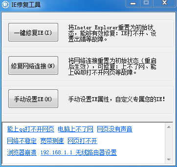 IE修复工具主治ie浏览器各种疑难杂症,具有一键修复ie浏览器,让其恢复到刚用之处。IE浏览器时间用长了多少会有一些症状发生,究其原因通常都是一些软件擅自篡改的结果,问题可大可小,如果是对电脑部熟的朋友遇到这