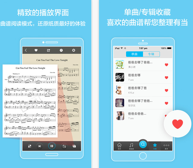 App里有我们用心整理的钢琴曲谱专辑,包含流行、古典、轻音乐、爵士等音乐分类。