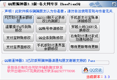 QQ照骗神器是一款专门针对QQ的装X神器,它可以帮助你进行财付通余额修改、聊天记录修改、支付宝账单修改、QQ业务到账修改、Q币充值成功修改等等,堪称一款QQ装逼神器!欢迎喜欢的朋友免费下载使用!