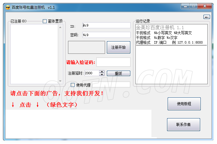百度账号批量注册机是一款简单小巧的百度账号注册机。支持批量注册百度账号。虽然界面上有醒目的红字广告,但实际上并不影响使用。如果不喜欢,可以在本站搜索下载其他版本的百度账号注册机使用。