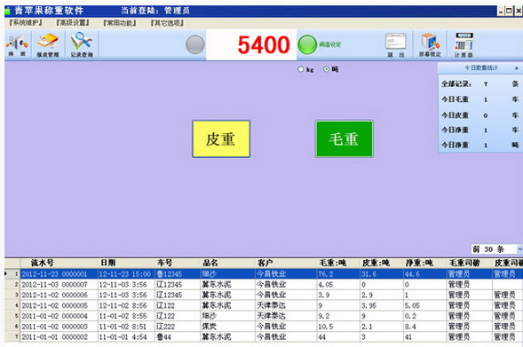 独特的过毛重,点毛重,过皮重,点皮重方式,确定--保存--打印.结构清晰,很容易上手,一看就会;