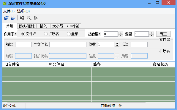 深蓝文件批量重命名工具是一款简单好用的文件批量重命名软件,它可以帮助你快速的将你要改名的文件进行重命名,同时支持批量改名,支持批量插入文字、插入序号、替换字符、文件名转大小写等,插入位置可随意控制,有需要的朋友快来下载使用吧!