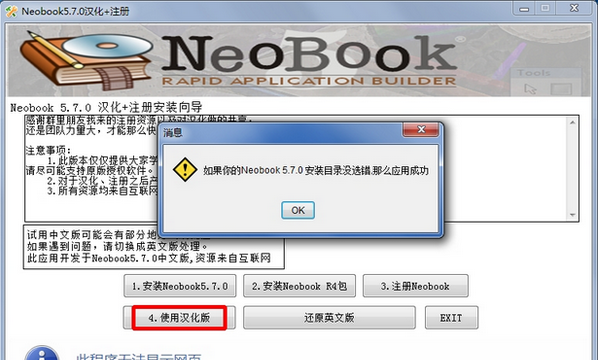 即可将汉化NeoBook,如果仍然是英文版本,请检查要汉化的NeoBook的目录是否选择正确。