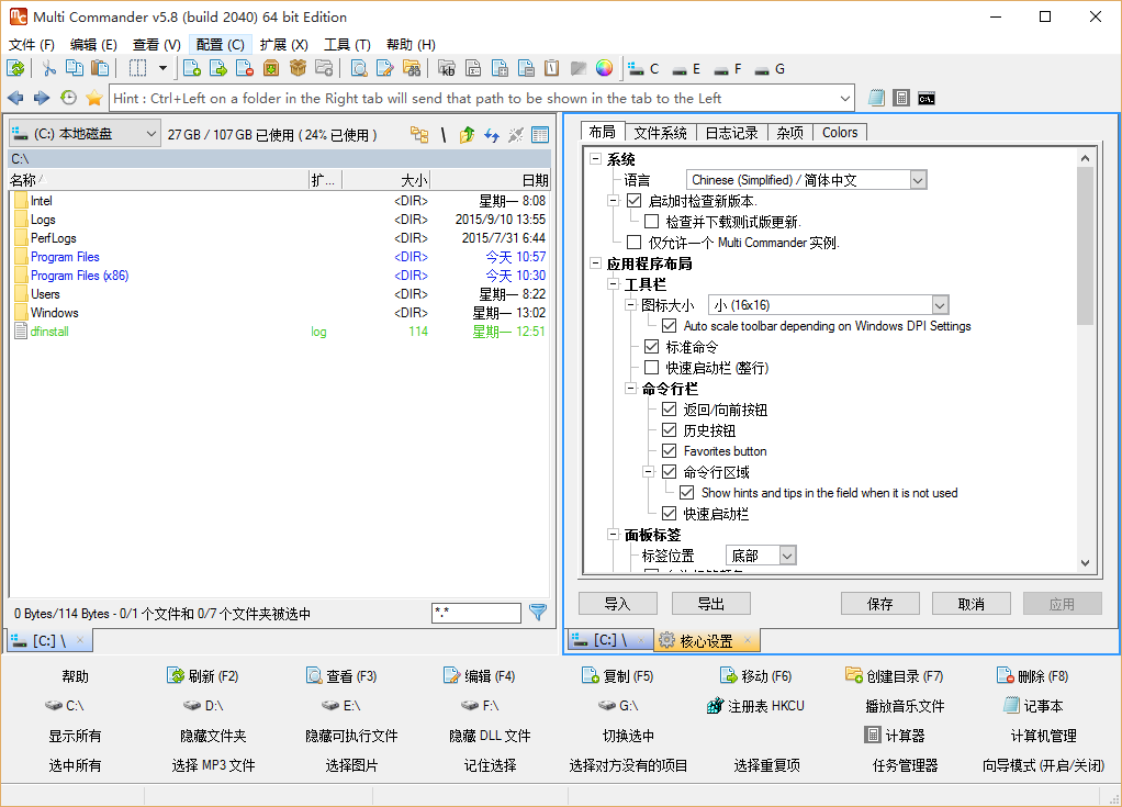 Multi Commander是一个标准的Windows资源管理器的代替软件,这款软件最大的亮点是带有双面板,并且还可以用标签的方式进行浏览,在界面底部还带各种常见的功能按钮。