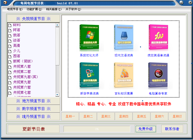 〖每周电视节目表〗,节目表更新快速、简单.软件同时提供经典爱情、信心指数、适应能力、合格丈夫、男性魅力、焦虑情绪、心中靓女、经典智力、健康状态等项目的测试游戏.软件同时提供今日天气预报、历史上的今天、今日滚动新闻、世界节日查询、特服号码查询、成年公历农历、度量转换查询等等实用的功能.软件使用简单,傻瓜式操作.软件绿色、环保、小巧、功能强大、可完全卸载,放心使用.