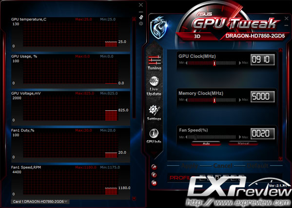 玩家不需要再被限制约束,可以冲击更高的频率。目前新版的GPU Tweak已经可以把HD 7850的电压提升到1.3V了。