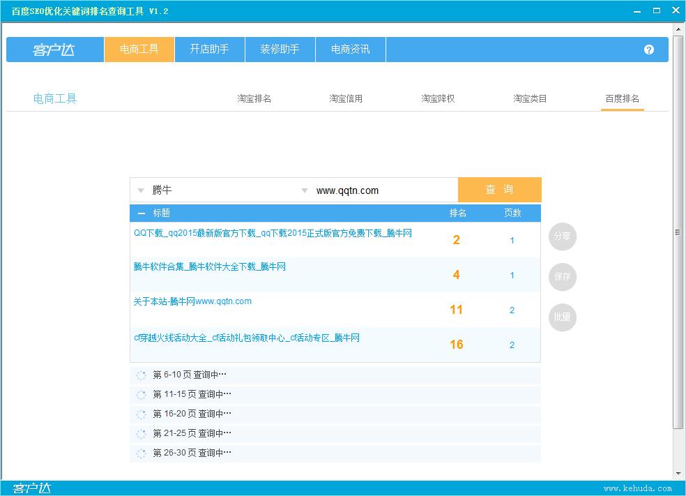 百度SEO工具:很多时候,当我们想优化一个关键词在百度排名中的位置时,我们必须先清楚:目标关键词,现在的百度排名是多少位?打个比方,当你想优化“查询工具”这个关键词时,一般的做法是:在百度中输入“查询工具”,然后按下Ctrl+F定位你的域名,网站实力够好的话 ,你的域名会出现在第一页。但是,网站实力不够好的话,你需要翻第2页,第3页……直至,翻到70页仍未见你的域名。这时,你才知道这样一个事 实:目标关键词,在百度仍谈不上排名。那么,有什么办法可以快速知道目标关键词的排名?使用这款工具,助你百度SEO一臂之力!