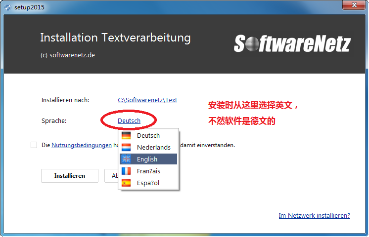 安装请在路径下面选择英文。不然默认安装的德文的。完全看不懂了。