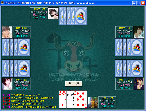 QQ欢乐斗牛单机版是一款专门根据QQ大厅游戏欢乐斗牛制作的单机版,游戏规则跟网络版的斗牛一摸一样哦,对这款游戏不是很熟的朋友可以用单机版练练手,想跟网友对战的话,QQ游戏大厅,黄金岛,白金岛这类大型的游戏平台都有网络版的斗牛供你选择。