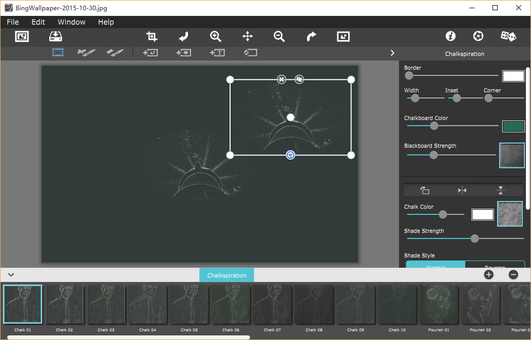 Chalkspiration开始通过自动转换您的图像垩白轮廓与遮光然后允许你从包括一夜暴富,横幅,装饰和字体库将物体。要开始,选择我们准备自定义预设模板之一;或从应用程序,将添加图像和剪贴画,然后让你调整大小,翻转,旋转和复制它们正是你想要的方式中创建自己使用的工具。