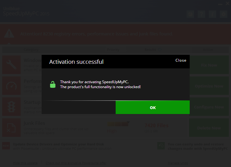 一旦问题得到解决,SpeedUpMyPC将适用于各种特殊的Uniblue工具和调整目的。