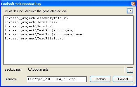 出现SolutionBackup主对话框,显示将被添加到ZIP备份文件。