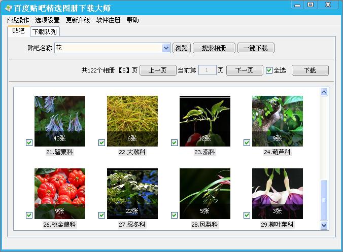 1、启动软件,输入贴吧名称,后点击“搜索相册”按钮,即开始搜索该贴吧下的图册,搜索到的图片以分页方式显示,每页显示30条记录。