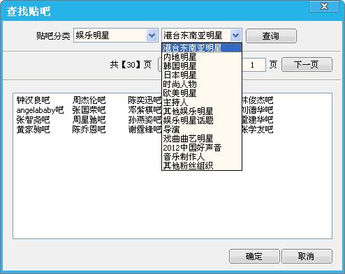 2、点击贴吧名称框后的“浏览”按钮,即可显示“查找贴吧”窗口,该窗口可以按贴吧的分类进行搜索。