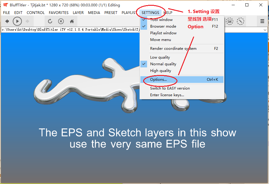 选择文件>打开显示...,然后从BluffTitler /媒体/显示/ Camera文件夹表演。