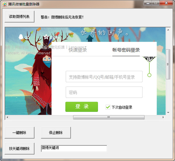 腾讯微博批量删除器是一款免费好用的微博批量删除工具,它能够帮助你快速批量删除已经发表的腾讯微博,只需轻松点点鼠标即可快速删除成百上千条微博,解决了目前腾讯微博无法批量删除的麻烦。